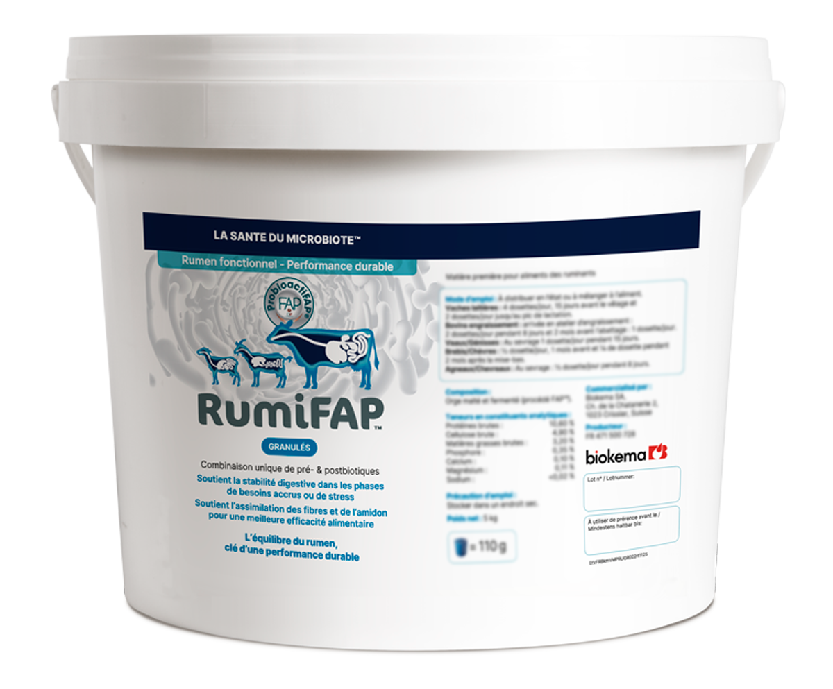RumiFAP™ est conçu pour accompagner les phases où le rumen est fonctionnel, en soutenant la stabilité digestive et l’efficacité alimentaire.